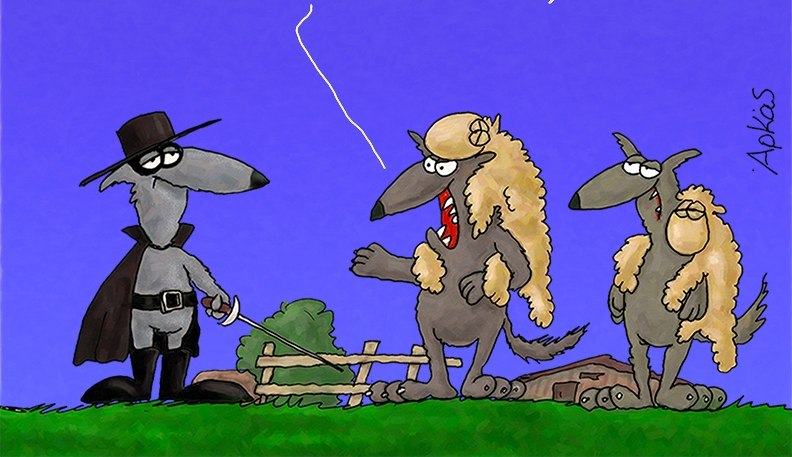 Στο σκίτσο βλέπουμε τρεις λύκους σε έναν αγρό. Ο ένας, ντυμένος σαν Ζορό, με καπέλο, μάσκα και ξίφος, στέκεται απέναντι από τους άλλους δύο, που έχουν ριχτεί… στον ρόλο τους. Φορούν προβιές προβάτων, προσπαθώντας –όχι και τόσο πειστικά– να μεταμφιεστούν.