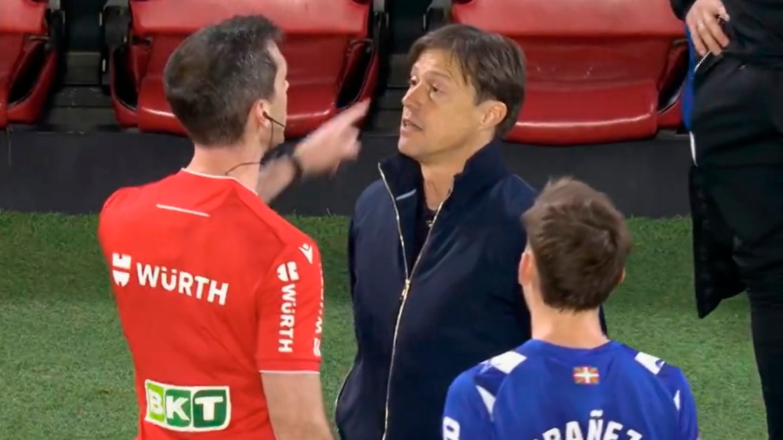Αυτή η κατάσταση οδήγησε στη διακοπή του αγώνα, ώστε να του ζητηθεί ξανά να φύγει από τον πάγκο. Σε αυτό το σημείο, ο προαναφερθείς προπονητής μπήκε στον αγωνιστικό χώρο και στάθηκε πρόσωπο με πρόσωπο μαζί μου, λίγα εκατοστά μακριά, με προκλητικό και εκφοβιστικό τρόπο. Αφού του ζητήθηκε επανειλημμένα να φύγει από τον αγωνιστικό χώρο, συνέχισε με τον ίδιο τρόπο, αντιμετωπίζοντάς με για περισσότερο από ένα λεπτό. Μόλις έφυγε από αυτή τη θέση, κλώτσησε επιθετικά ένα μπουκάλι νερό που βρισκόταν στο έδαφος. Στη συνέχεια επέστρεψε στον αγωνιστικό χώρο και αντιμετώπισε τον τέταρτο διαιτητή με τον ίδιο τρόπο, απαιτώντας τη συνοδεία του εκτός γηπέδου από μέλη της ομάδας του και προσωπικό ασφαλείας του συλλόγου. Ως αποτέλεσμα αυτών των γεγονότων, ο αγώνας διακόπηκε για τρία λεπτά».