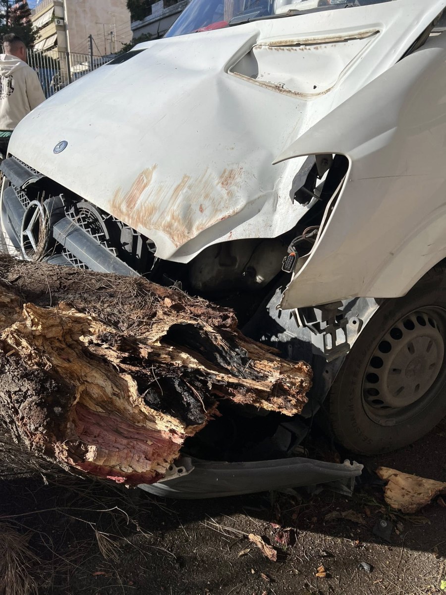 Όπως φαίνεται και στις εικόνες το δέντρο που έπεσε κάλυψε όλο τον δρόμο ενώ προκάλεσε φθορές και σε ένα βαν.