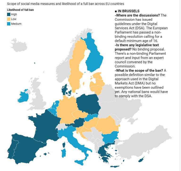 Η Γαλλία έχει προχωρήσει ακόμη περισσότερο, σχεδιάζοντας απαγόρευση για παιδιά κάτω των 15 ετών, με στόχο την εφαρμογή από τον Σεπτέμβριο του επόμενου σχολικού έτους. Στην Ισπανία, ο πρωθυπουργός Πέδρο Σάντσεθ έχει προτείνει όριο στα 16 έτη, αν και απαιτούνται κοινοβουλευτικές αλλαγές.