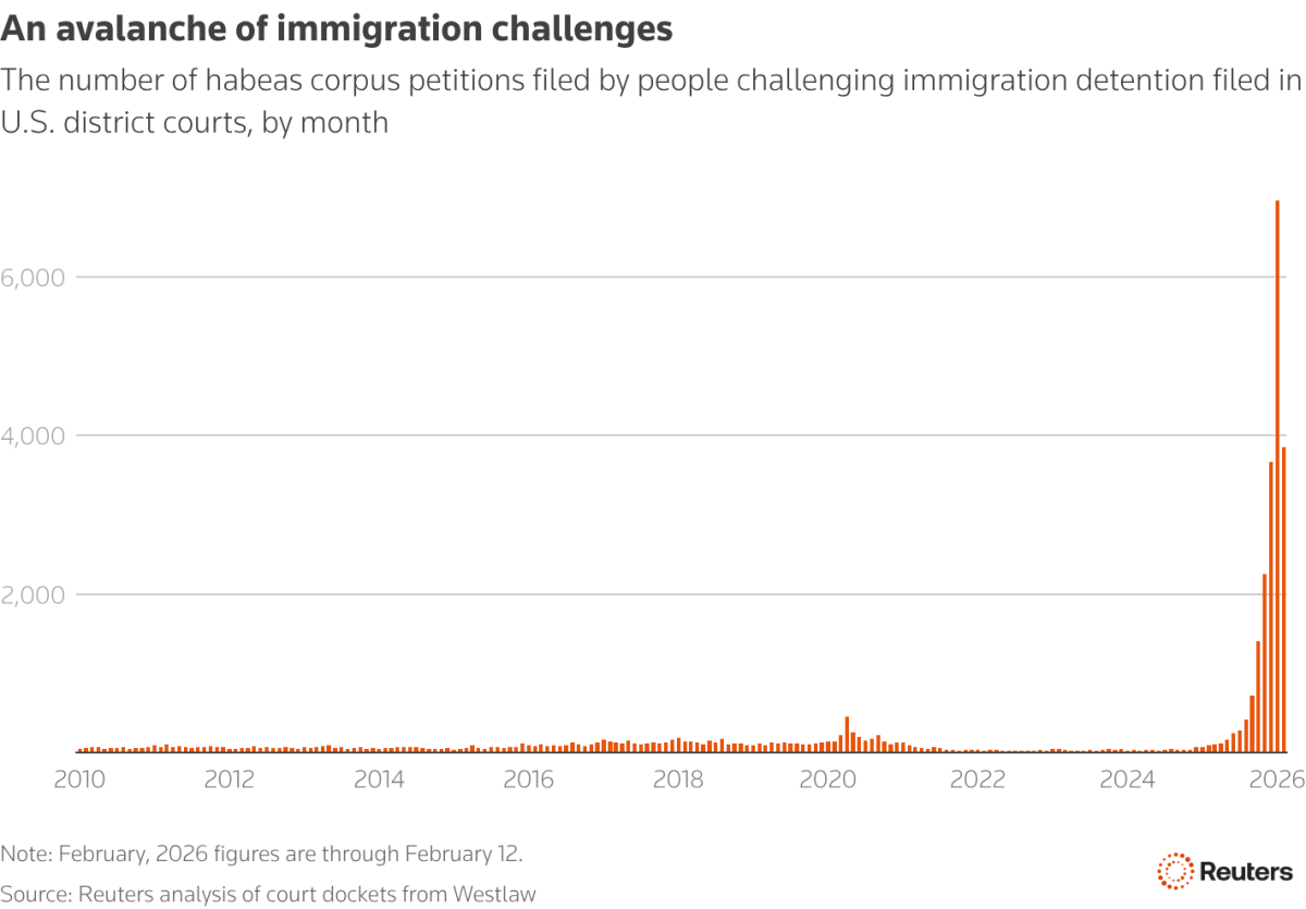 Σύμφωνα με έρευνα του Reuters, που ανέλυσε περισσότερες από δύο δεκαετίες δημόσιων ομοσπονδιακών δικαστικών αρχείων, ο αριθμός των αγωγών habeas corpus έχει εκτοξευθεί. Τα δεδομένα αποτυπώνουν τη μαζική προσφυγή μεταναστών στα δικαστήρια και ταυτόχρονα τις αυξανόμενες ήττες της κυβέρνησης σε σχετικές υποθέσεις.