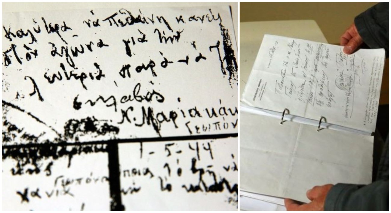 Αριστερά: Το σημείωμα που πέταξε στους δρόμους της Αθήνας κατά τη μεταφορά του από το Στρατόπεδο Χαϊδαρίου προς το Σκοπευτήριο της Καισαριανής ο γεωπόνος Νίκος Μαριακάκης, που εκτελέστηκε από τους Ναζί την Πρωτομαγιά του 1944. Δεξιά: Άντρας κοιτάζει τον ατομικό φάκελο του Γιάννη Τριάρχη, που εκτελέστηκε από τους Ναζί στο Σκοπευτήριο της Καισαριανής/ΑΠΕ-ΜΠΕ-ΟΡΕΣΤΗΣ ΠΑΝΑΓΙΩΤΟΥ