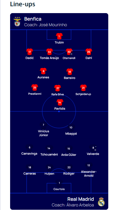 Ρεάλ Μαδρίτης: Κουρτουά, Άρνολντ, Χάουσεν, Ρίντιγκερ, Καρέρας, Βαλβέρδε, Τσουαμενί, Καμαβινγκά, Γκιουλέρ, Βινίσιους, Εμπαπέ.