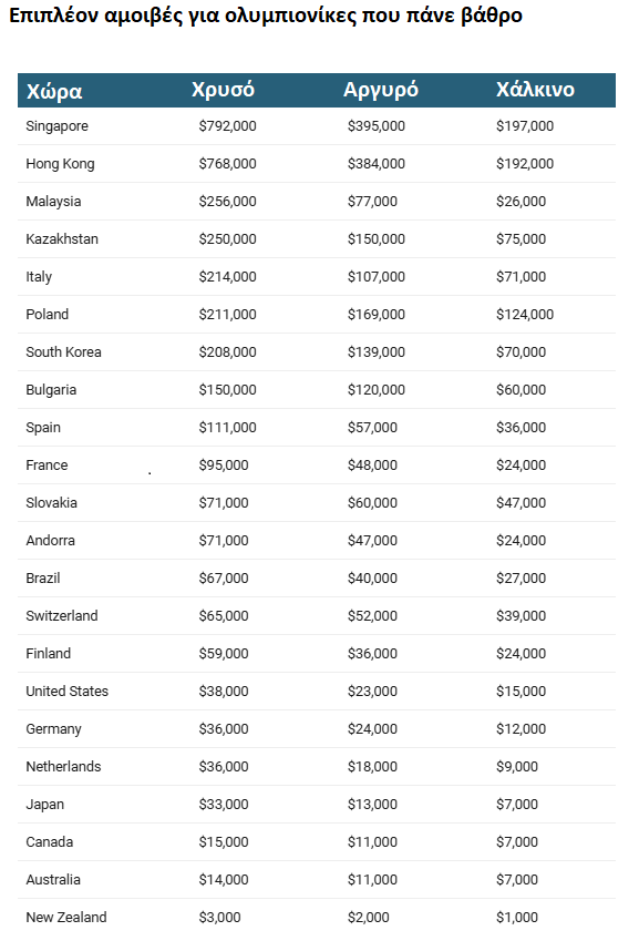 Ενώ η Διεθνής Ολυμπιακή Επιτροπή δεν απονέμει χρηματικά έπαθλα, πολλές κυβερνήσεις και εθνικοί Ολυμπιακοί φορείς προσφέρουν χρηματικά μπόνους, αναφέρει το CNBC.