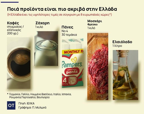 Στο ελαιόλαδο (1 λίτρο), η τιμή στην Ελλάδα (7,69 ευρώ) είναι –26,8% χαμηλότερη από τον μέσο όρο (10,51 ευρώ). Όμως ο μέσος όρος διαμορφώνεται από ιδιαίτερα υψηλές τιμές σε Γερμανία (15,65 ευρώ) και Γαλλία (14,38 ευρώ). Η Ελλάδα παραμένει ακριβότερη από Ρουμανία και Βουλγαρία και συγκρίσιμη με χώρες της Νότιας Ευρώπης. Στις πάνες (Νο 4, 30 τεμάχια), η τιμή στην Ελλάδα (10,13 ευρώ) είναι περίπου –9,9% χαμηλότερη από τον μέσο όρο (11,24 ευρώ), καθώς Ιρλανδία και Ρουμανία εμφανίζουν σημαντικά υψηλότερες τιμές. Ωστόσο, η Ελλάδα παραμένει ακριβότερη από Ιταλία, Πορτογαλία και Ισπανία.