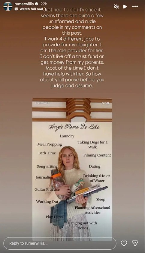 Η κόρη του Μπρους Γουίλις και της Ντεμί Μουρ, Ρούμερ, απάντησε με ειλικρίνεια στις επικρίσεις που δέχεται για τον τρόπο ζωής της, ξεκαθαρίζοντας πως η ανατροφή της δίχρονης κόρης της βασίζεται αποκλειστικά στις δικές της δυνάμεις