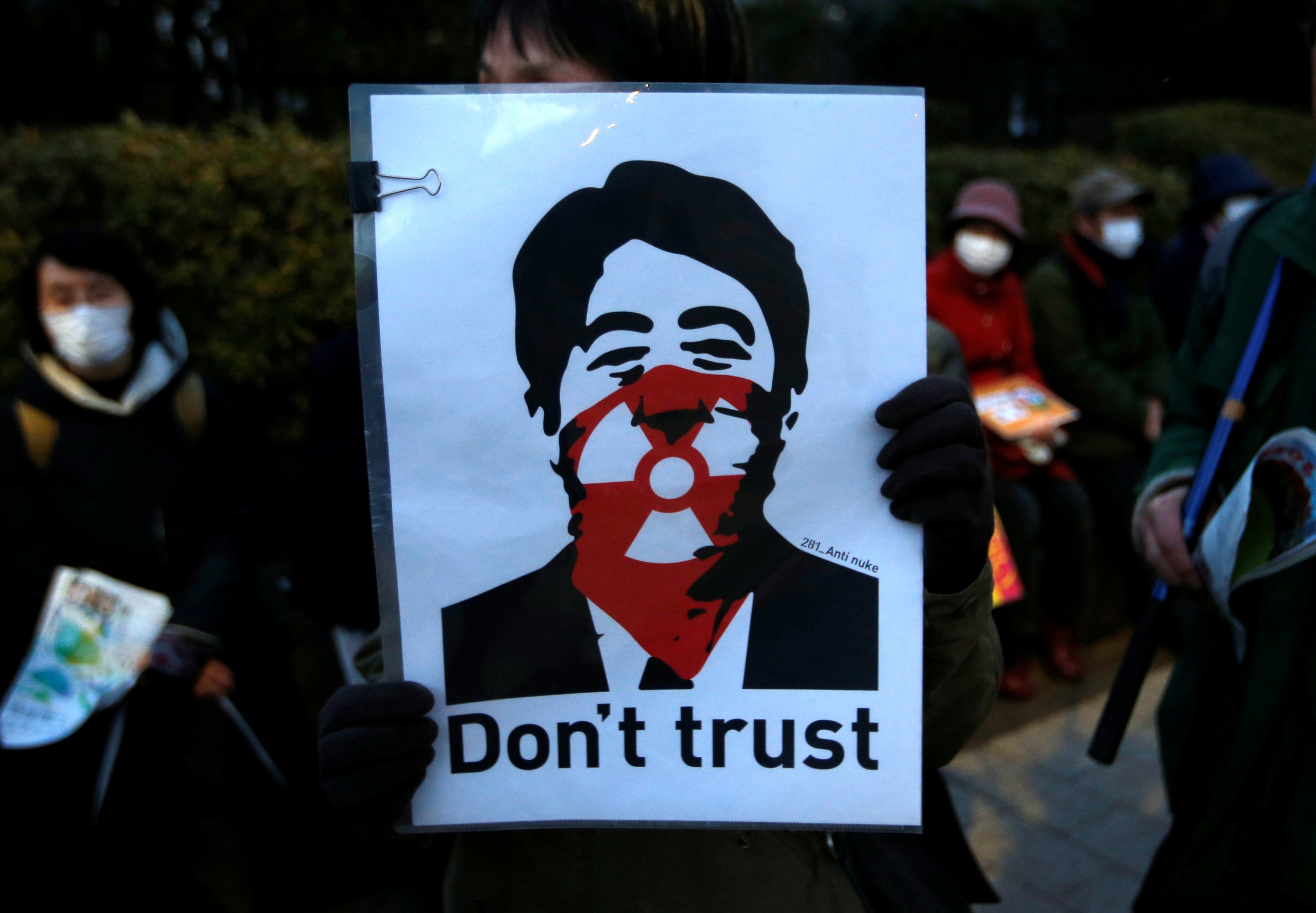 Ένας διαδηλωτής κρατά ένα πλακάτ που απεικονίζει τον πρωθυπουργό της Ιαπωνίας Σίνζο Άμπε κατά τη διάρκεια συγκέντρωσης μπροστά από το κτίριο του κοινοβουλίου στο Τόκιο της Ιαπωνίας, στις 11 Μαρτίου 2017, για τον εορτασμό της εξαετούς επετείου από τον σεισμό και το τσουνάμι της 11ης Μαρτίου 2011 που σκότωσαν χιλιάδες ανθρώπους και πυροδότησαν μια πυρηνική κρίση