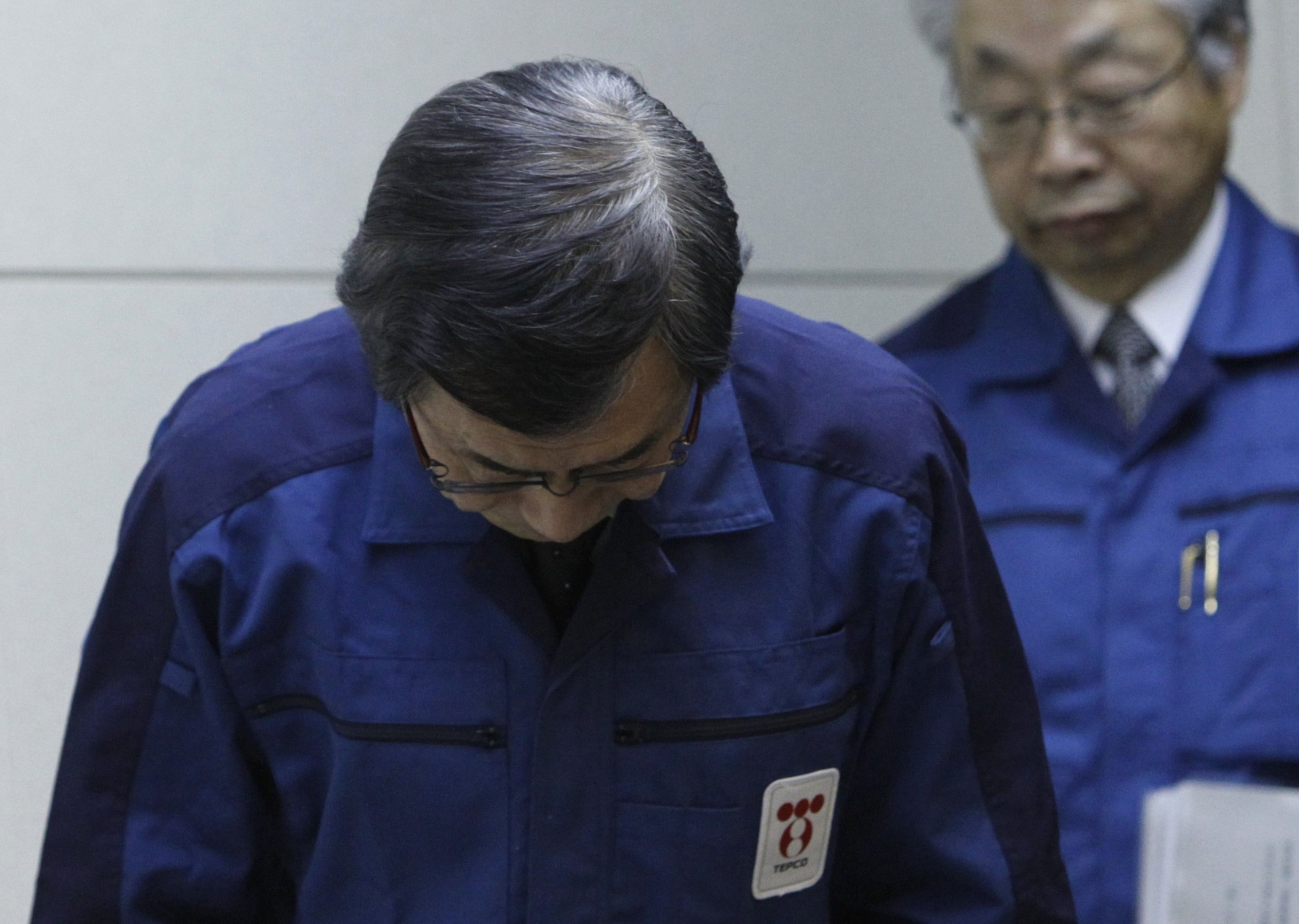 Ο πρόεδρος της Tokyo Electric Power Co. (TEPCO), Masataka Shimizu, υποκλίνεται δίπλα στον Εκτελεστικό Αντιπρόεδρο Takashi Fujimoto (δεξιά) καθώς εισέρχονται σε αίθουσα συνέντευξης Τύπου στα κεντρικά γραφεία της TEPCO στο Τόκιο, στις 13 Απριλίου 2011.
