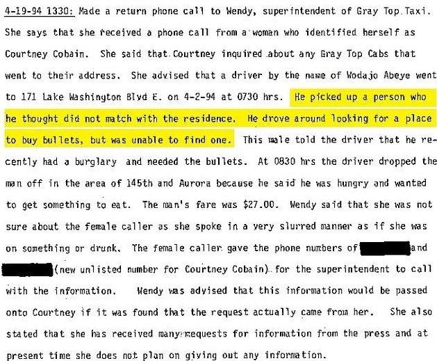Αναφέρεται επίσης σε παλαιότερη αστυνομική αναφορά που μιλούσε για οδηγό ταξί ο οποίος παρέλαβε άτομο από την κατοικία του Κομπέιν «που δεν ταίριαζε με την κατοικία», αφήνοντας υπαινιγμό ότι ίσως να μην ήταν ο ίδιος. Σύμφωνα με εκείνη την αναφορά, ο επιβάτης και ο οδηγός δεν κατάφεραν να βρουν κατάστημα για να αγοράσουν πυρομαχικά — στοιχείο που δεν εμφανίστηκε σε μεταγενέστερη σύνοψη της υπόθεσης.