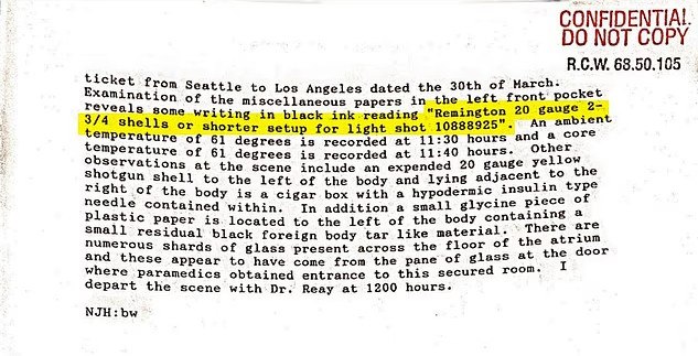 Ο Νιλ Λόου, που υπηρέτησε επί 50 χρόνια στο Αστυνομικό Τμήμα του Σιάτλ και το 2005 ανέλαβε εσωτερικό έλεγχο του φακέλου, δηλώνει ξεκάθαρα στην Daily Mail: «Δεν μπορώ να δεχτώ ότι ο Κερτ το έκανε αυτό στον εαυτό του».