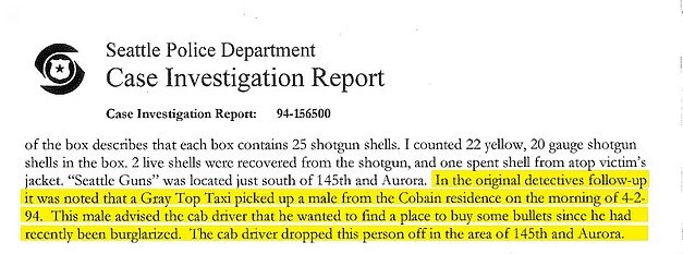 Αναφέρεται επίσης σε παλαιότερη αστυνομική αναφορά που μιλούσε για οδηγό ταξί ο οποίος παρέλαβε άτομο από την κατοικία του Κομπέιν «που δεν ταίριαζε με την κατοικία», αφήνοντας υπαινιγμό ότι ίσως να μην ήταν ο ίδιος. Σύμφωνα με εκείνη την αναφορά, ο επιβάτης και ο οδηγός δεν κατάφεραν να βρουν κατάστημα για να αγοράσουν πυρομαχικά — στοιχείο που δεν εμφανίστηκε σε μεταγενέστερη σύνοψη της υπόθεσης.