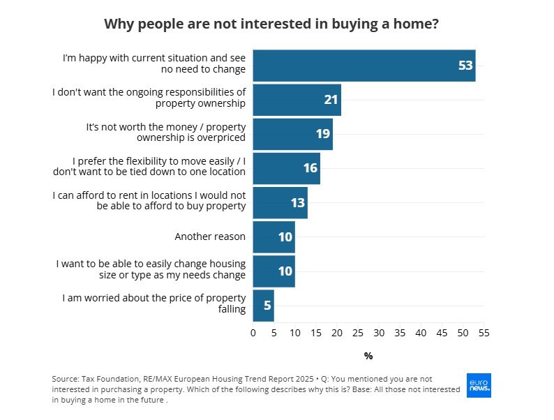 Οι λόγοι για τους οποίους κάποιοι δεν θέλουν να αγοράσουν ακίνητο ποικίλλουν. Ωστόσο, αυτή η ομάδα – που δηλώνει ότι δεν ενδιαφέρεται για αγορά κατοικίας – αποτελεί μια μικρή μειοψηφία μεταξύ των μη ιδιοκτητών (15%). Κατά μέσο όρο στις 23 χώρες, πάνω από τους μισούς (53%) δηλώνουν ότι είναι ικανοποιημένοι με την τρέχουσα κατάστασή τους και δεν βλέπουν λόγο να αγοράσουν σπίτι.