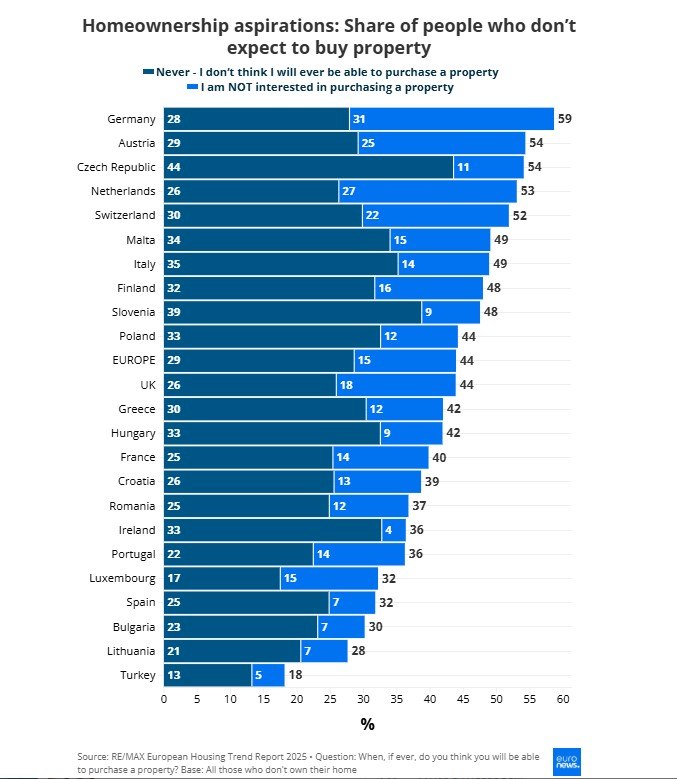 Στο πλαίσιο της έρευνας που διεξήχθη τον Αύγουστο, ετέθη το ερώτημα «πότε, αν ποτέ, πιστεύετε ότι θα μπορέσετε να αγοράσετε ένα ακίνητο». Η απάντηση ήταν «ποτέ» για κατά μέσο όρο 29% των ερωτηθέντων. Το ποσοστό αυτό κυμάνθηκε από 13% στην Τουρκία έως 44% στην Τσεχία.