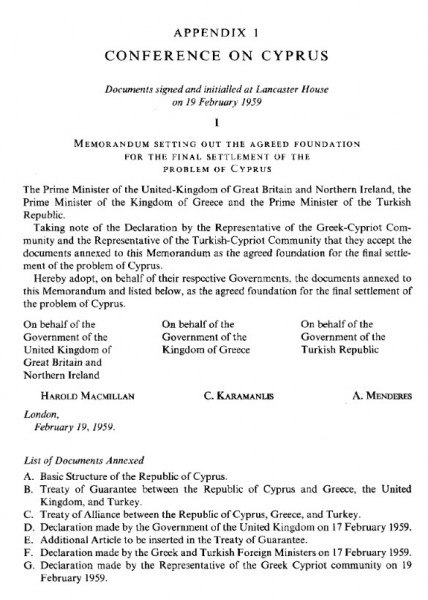 Μετά τη μονογραφή των συμφωνηθέντων στη Ζυρίχη από τους πρωθυπουργούς της Ελλάδας και της Τουρκίας, Κωνσταντίνο Καραμανλή και Αντνάν Μεντερές, στις 11 Φεβρουαρίου 1959, ακολούθησε διάσκεψη των ενδιαφερομένων μερών στο Λονδίνο, όπου προσκλήθηκαν επίσης ο Αρχιεπίσκοπος Μακάριος και ο ηγέτης των Τουρκοκυπρίων, Φαζίλ Κουτσιούκ.