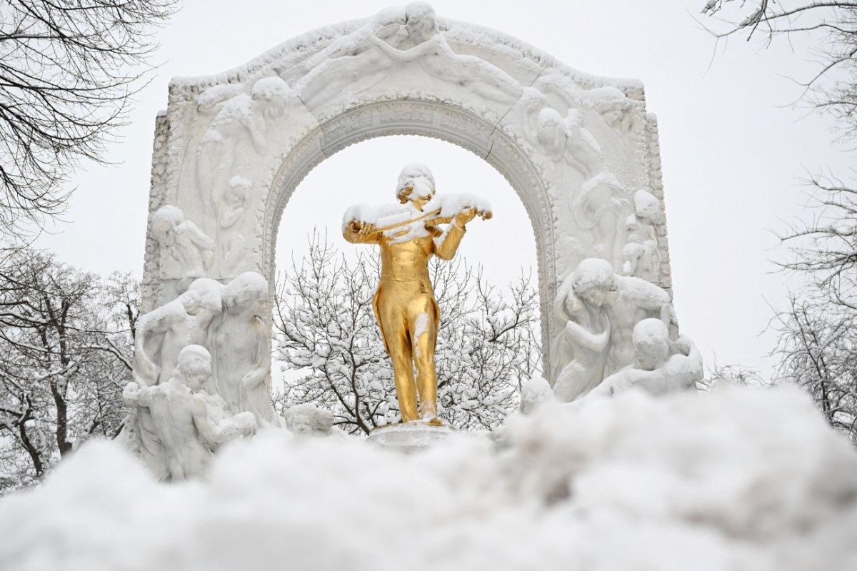Χιόνι έχει σκεπάσει μνημείο για τον Γιόχαν Στράους.