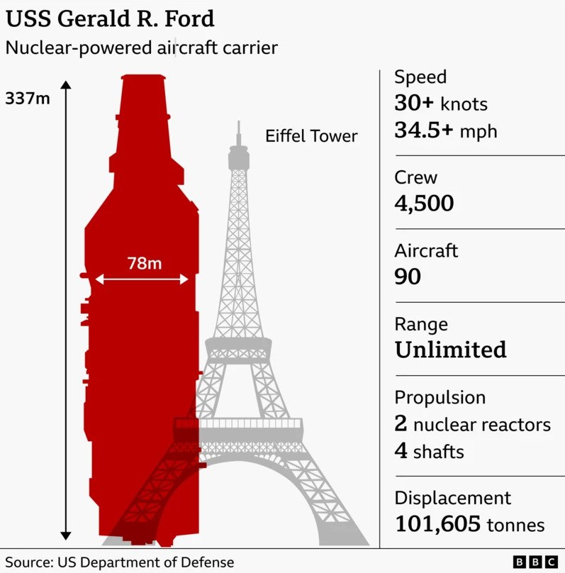 Το BBC σε γράφημά του εξηγεί τις δυνατότητες του συγκεκριμένου πυρηνοκίνητου αεροπλανοφόρου:
