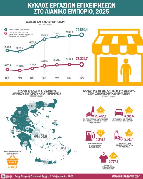 Αν αφαιρέσουμε από τις ΜμΕ τους κλάδους οχημάτων, τροφίμων και καυσίμων, ο κύκλος εργασιών του λιανεμπορίου το τέταρτο τρίμηνο του 2025 ανήλθε σε 5,46 δισ ευρώ, σημειώνοντας οριακή αύξηση μόλις 0,4%. Προκειται για το 1/6 της μεσοσταθμικής αύξησης του πληθωρισμού, γεγονός που αντανακλά επίσης μείωση του όγκου κατανάλωσης.