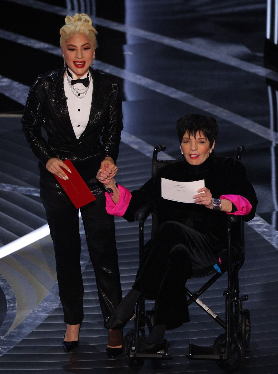 «Γεια σε όλους! Είμαι πολύ χαρούμενη που βρίσκομαι εδώ, ειδικά μαζί σου», απάντησε η Minnelli. «Είμαι η μεγαλύτερη θαυμάστριά σου. Είσαι ενθουσιασμένη που θα ανακοινώσεις την καλύτερη ταινία; Και το Όσκαρ πηγαίνει σε…», είπε η Gaga.