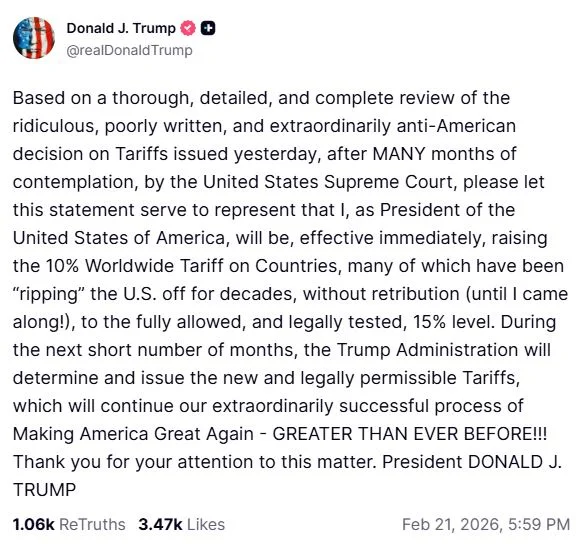 «Με βάση μια διεξοδική, λεπτομερή και πλήρη ανασκόπηση της γελοίας, κακογραμμένης και εξαιρετικά αντιαμερικανικής απόφασης σχετικά με τους δασμούς που εκδόθηκε χθες, μετά από πολλούς μήνες σκέψης, από το Ανώτατο Δικαστήριο των ΗΠΑ, παρακαλώ να θεωρηθεί η παρούσα δήλωση ως δήλωση ότι εγώ, ως Πρόεδρος των Ηνωμένων Πολιτειών της Αμερικής, θα αυξήσω, με άμεση ισχύ, τον παγκόσμιο δασμό 10% σε χώρες, πολλές από τις οποίες «εκμεταλλεύονταν» τις Ηνωμένες Πολιτείες για δεκαετίες, χωρίς αντίποινα (μέχρι που ήρθα εγώ!), στο πλήρως επιτρεπόμενο και νομικά ελεγμένο επίπεδο του 15%. Κατά τη διάρκεια των επόμενων λίγων μηνών, η κυβέρνηση Τραμπ θα καθορίσει και θα εκδώσει τους νέους και νομικά επιτρεπόμενους δασμούς, οι οποίοι θα συνεχίσουν την εξαιρετικά επιτυχημένη διαδικασία μας για να κάνουμε την Αμερική ξανά μεγάλη – μεγαλύτερη από ποτέ! Σας ευχαριστώ για την προσοχή σας σε αυτό το θέμα. Πρόεδρος Ντόναλντ Τραμπ», έγραψε ο Τραμπ σε ανάρτηση στα μέσα κοινωνικής δικτύωσης το Σάββατο.