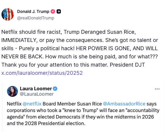 «Το Netflix πρέπει να απολύσει τη ρατσίστρια, που στέκεται εμμονικά κατά του Τραμπ, Σούζαν Ράις, άμεσα, αλλιώς θα υποστεί τις συνέπειες», έγραψε ο πρόεδρος των ΗΠΑ. «Δεν έχει κανένα ταλέντο ή ικανότητες – είναι καθαρά ένα πολιτικό πιόνι! Η δύναμή της έχει τελειώσει και δεν θα επιστρέψει ποτέ. Πόσα πληρώνεται και για ποιο λόγο;;; Ευχαριστώ για την προσοχή σας στο θέμα. Πρόεδρος Ντόναλντ Τραμπ».