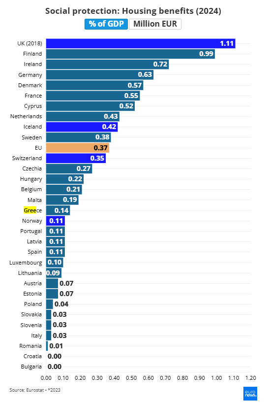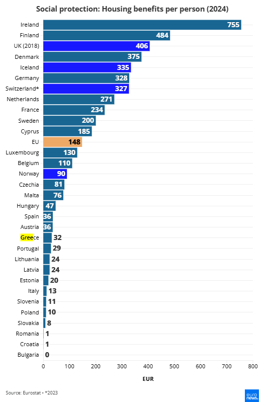Σύμφωνα με τα στοιχεία του Euronews για την Ευρώπη, για χώρες όπως η Ελλάδα δεν αναφέρονται υψηλά επιδόματα στέγασης ανά άτομο μέσα στο σχετικό πίνακα, γεγονός που δείχνει ότι η Ελλάδα βρίσκεται στις χώρες που επενδύουν σχετικά λίγα στην άμεση οικονομική στήριξη για ενοίκια ή κοινωνική στέγαση σε σχέση με τον ευρωπαϊκό μέσο όρο και πολύ πίσω από χώρες όπως η Ιρλανδία, η Φινλανδία ή η Γερμανία.