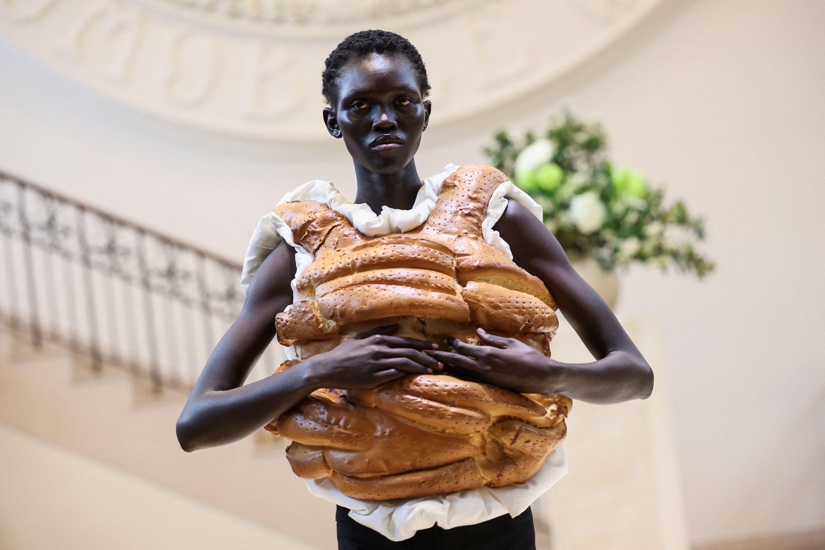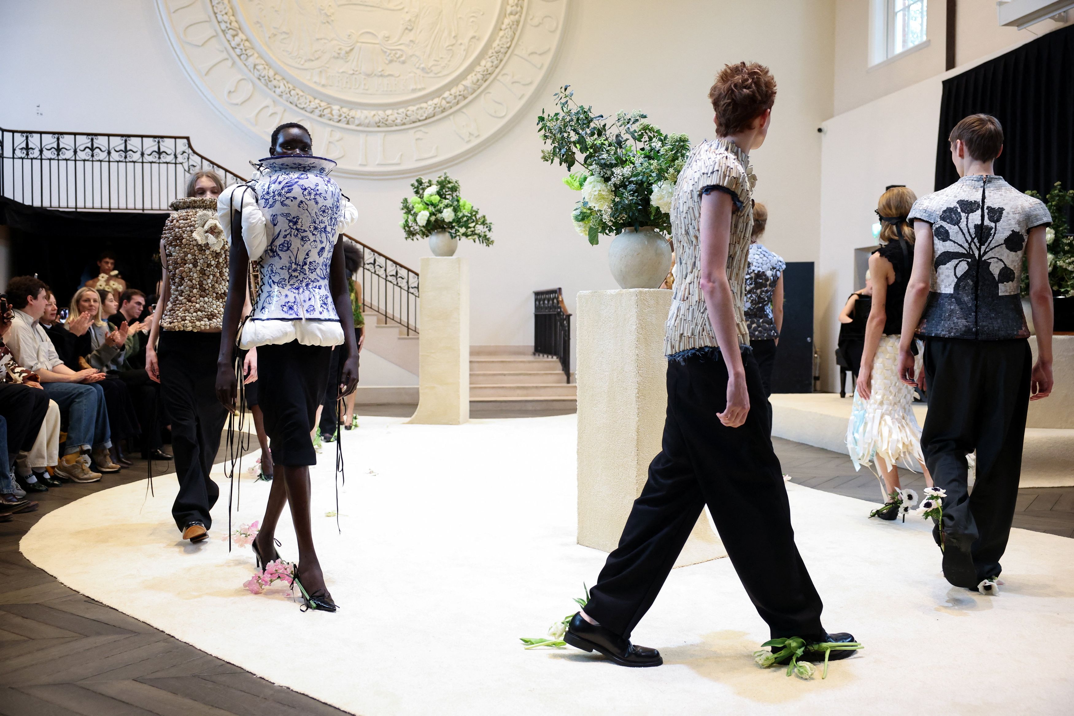 Τεράστια πορσελάνινα βάζα μετατράπηκαν σε κορσέδες, με μεταξωτές κορδέλες στο πίσω μέρος και στα πλάγια, παραμένοντας εξαιρετικά βαριά για να φορεθούν. Λουλούδια ξεφύτρωναν από τα τακούνια των μοντέλων, δεμένα στα πόδια τους.