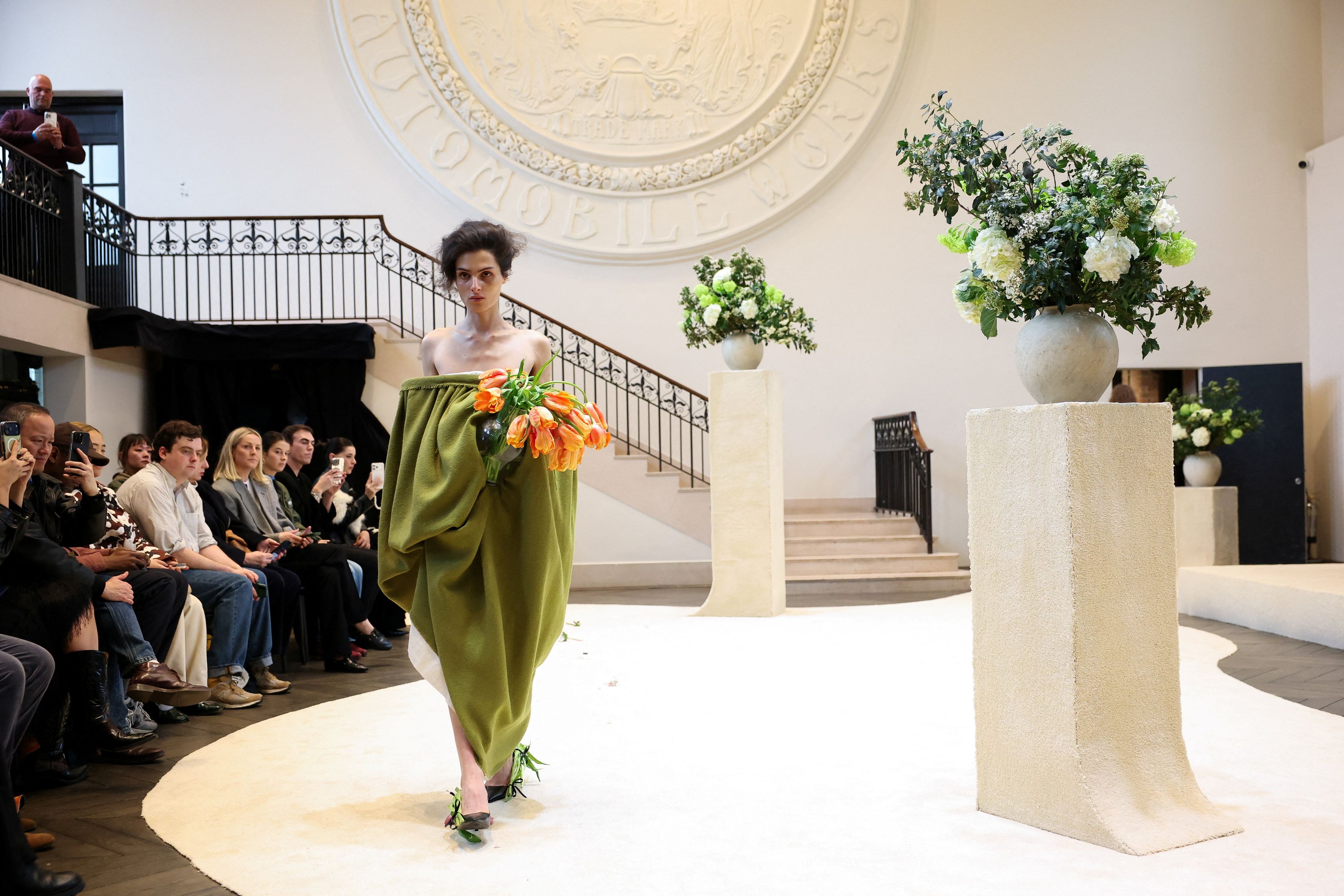 Ένας πιανίστας έπαιζε σε ένα πιάνο με ουρά, ενώ τα μοντέλα περπατούσαν ανάμεσα σε ανθοσυνθέσεις, αφήνοντας πίσω τους ένα μονοπάτι από πέταλα.