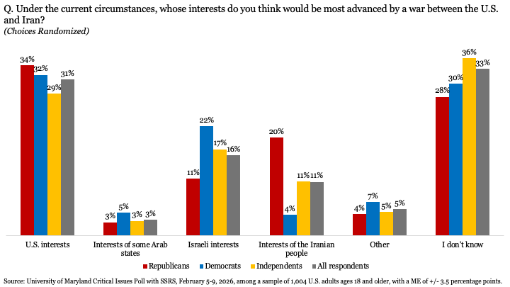 Στην ερώτηση ποια συμφέροντα θα εξυπηρετούσε περισσότερο ένας πόλεμος με το Ιράν, το 31% απάντησε των ΗΠΑ, το 35% άλλων μερών και το 33% δεν γνώριζε