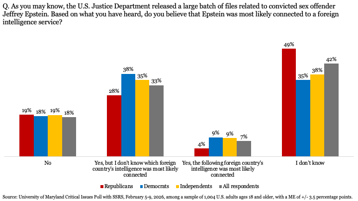 Το 40% των ερωτηθέντων δήλωσε ότι ο Έπσταϊν ήταν πιθανότατα συνδεδεμένος με μια ξένη υπηρεσία πληροφοριών, ενώ το 18% απέρριψε αυτή την άποψη.