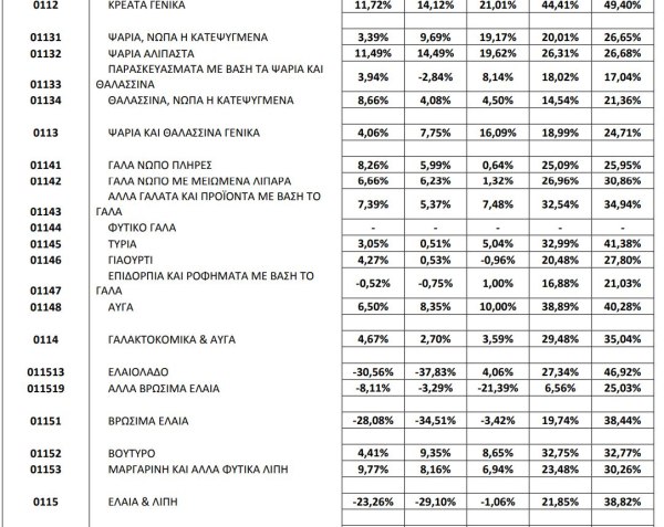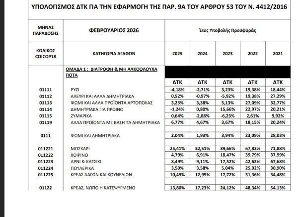 Η τελευταία εγκύκλιος του Φεβρουαρίου, που αντλεί στοιχεία από την ΕΛΣΤΑΤ, παραθέτει τις ανατιμήσεις σε όλους τους κωδικούς του καλαθιού του καταναλωτή, σε βάθος πενταετίας (2021-25), με σκοπό την αναπροσαρμογή του τιμήματος των συμβάσεων με αντικείμενο την προμήθεια αγαθών.