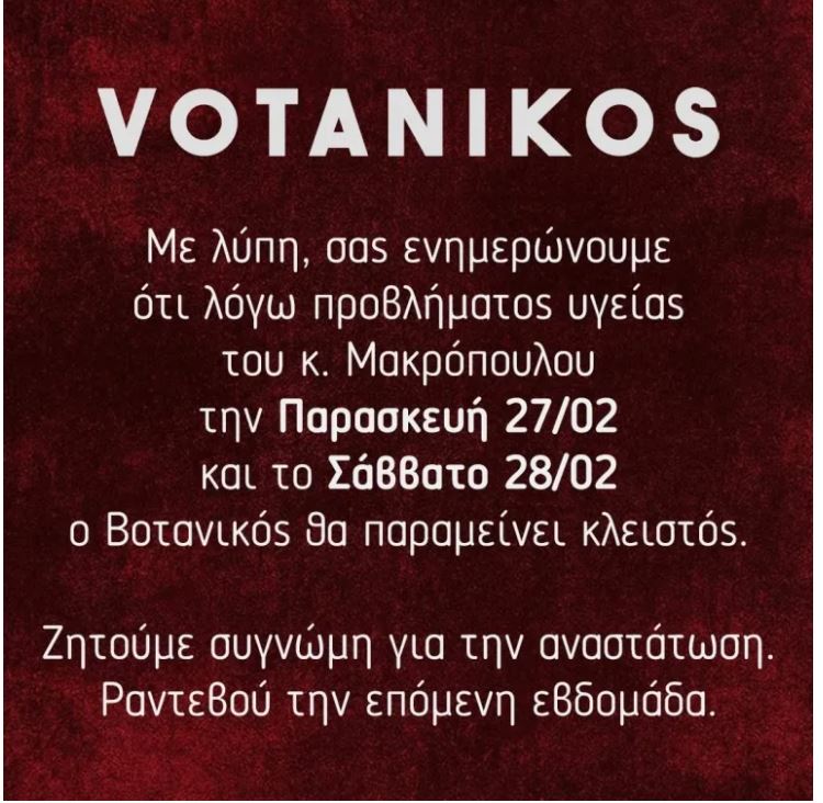 «Με λύπη, σας ενημερώνουμε ότι λόγω προβλήματος υγείας του κ. Μακρόπουλου την Παρασκευή 27/02 και το Σάββατο 28/02, ο Βοτανικός θα παραμείνει κλειστός» αναφέρεται στο post του Βοτανικού ενώ στη λεζάντα αναγράφεται: «Σας ζητούμε συγνώμη για την αναστάτωση. Ραντεβού την επόμενη εβδομάδα».