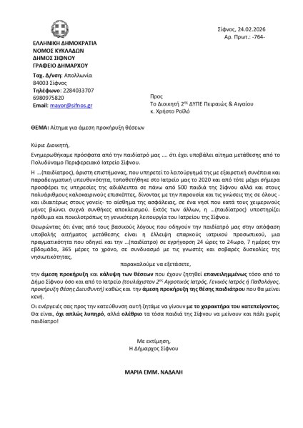 Επισημαίνεται παράλληλα η ανάγκη άμεσης προκήρυξης των κενών θέσεων, με αιτήματα τόσο από το Δήμο Σίφνου όσο και από την ίδια την Ιατρική Υπηρεσία για την κάλυψη των θέσεων δύο τουλάχιστον αγροτικών γιατρών, γενικού γιατρού ή παθολόγου, καθώς και της θέσης παιδιάτρου που ενδέχεται να μείνει κενή. Το αίτημα υπογραμμίζει επίσης την επείγουσα ανάγκη να μην αφήσουν τα παιδιά του νησιού χωρίς τη βασική αυτή ιατρική φροντίδα.