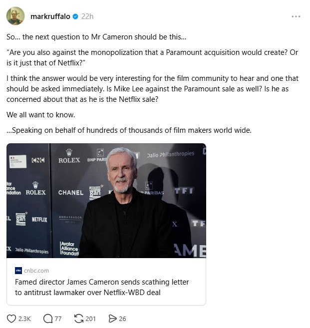 Η αντιπαράθεση για το deal Netflix–Warner Bros. φουντώνει, με τον Μαρκ Ράφαλο να ρωτά δημόσια τον Τζέιμς Κάμερον αν θα αντιδρούσε το ίδιο και σε μια εξαγορά από την Paramount ή αν στοχοποιεί μόνο τη Netflix