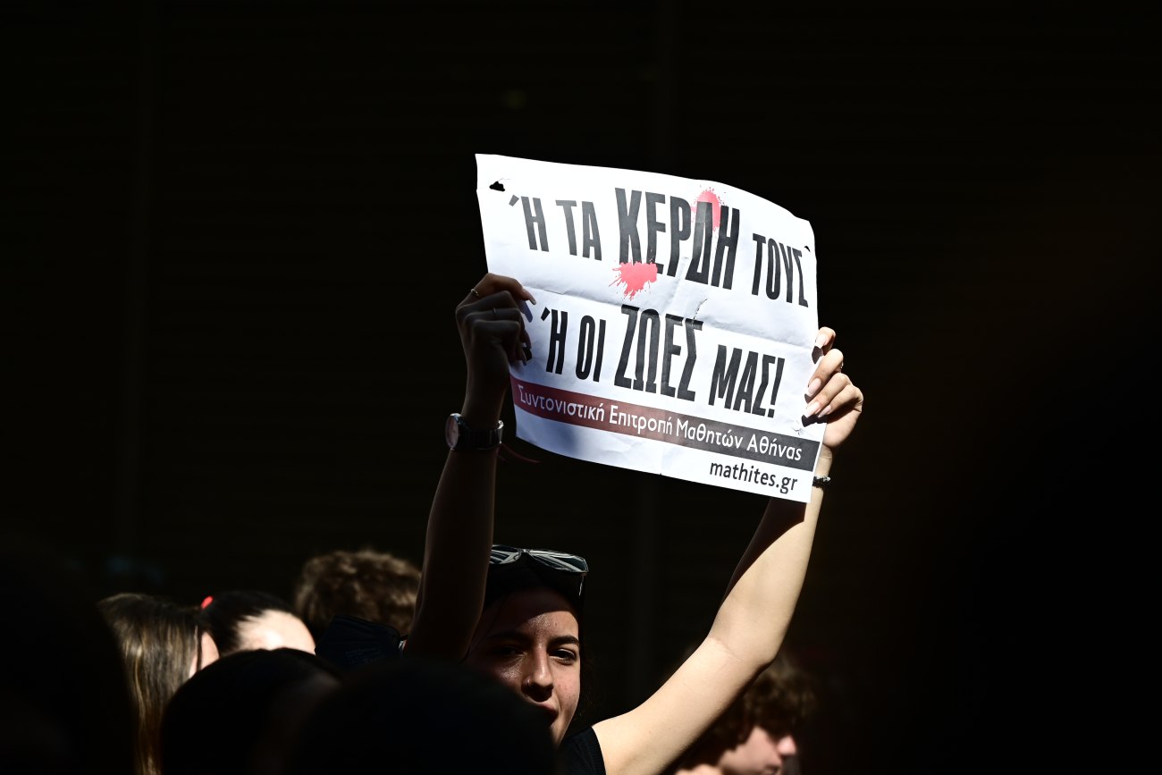 Κρατάμε την υπόσχεσή μας, όλων των νεκρών γινόμαστε η φωνή το έγκλημα αυτό δε θα συγκαλυφθεί! Οι μαθητές από όλα τα σχολεία της Αττικής βγαίνουμε στους δρόμους! Γιατί το σύνθημά μας «Τα κέρδη τους ή οι ζωές μας» σήμερα επιβεβαιώνεται από τη ζωή μας! Γιατί παραμένει εδώ η πολιτική που μετράει τις ζωές και τις ανάγκες μας σε ευρώ, η πολιτική των κερδών που κάνει τις ζωές μας «κοιλάδες των Τεμπών»!».