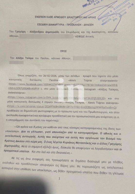 Εξώδικο στον Αλέξη Τσίπρα απέστειλε ο Γρηγόρης Δημητριάδης, λίγη ώρα μετά τις δηλώσεις του πρώην πρωθυπουργού για την απόφαση του δικαστηρίου στο σκάνδαλο των υποκλοπών.