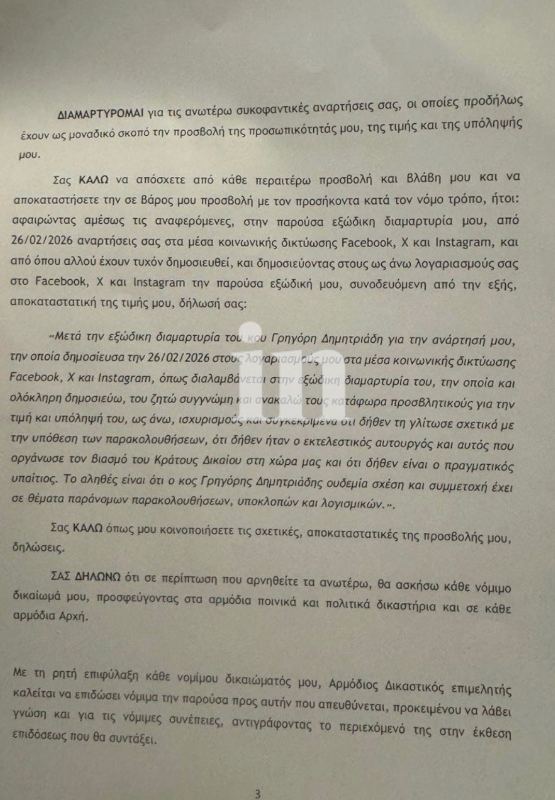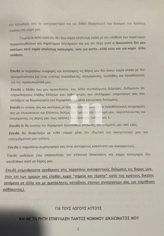 «Πληροφορήθηκα πριν από λίγο ότι ο πρωθυπουργικός ανιψιός μου απέστειλε εξώδικο για τις δηλώσεις μου σχετικά με την απόφαση του δικαστηρίου για τις υποκλοπές.
