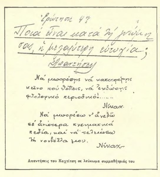 Στην κεντρική φωτογραφία του παρόντος άρθρου, ο Νίκος Καχτίτσης σε σχέδιο του Ανακρέοντος Καναβάκη (πηγή: «ΤΟ ΒΗΜΑ», 19.5.1985, Ιστορικό Αρχείο «ΤΟ ΒΗΜΑ» & «ΤΑ ΝΕΑ»).