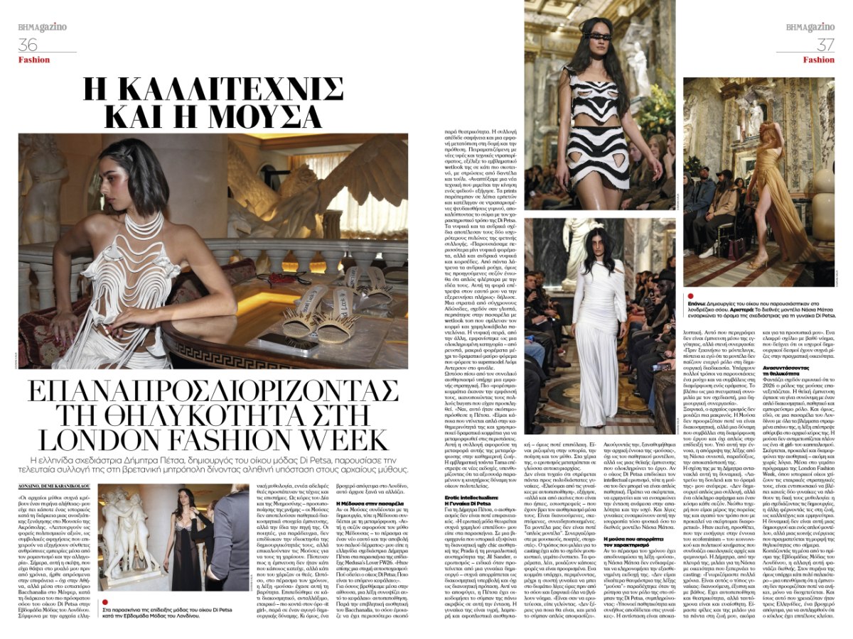 Στο διεθνές προσκήνιο της μόδας, η Ελληνίδα σχεδιάστρια Δήμητρα Πέτσα επαναπροσδιορίζει τη θηλυκότητα μέσα από τον οίκο Di Petsa, παρουσιάζοντας τη νέα συλλογή της στην London Fashion Week. Με έμπνευση από αρχαίους μύθους και σύγχρονες αφηγήσεις σωμάτων, δίνει υπόσταση σε μια θηλυκότητα ρευστή, δυναμική και βαθιά πολιτική.