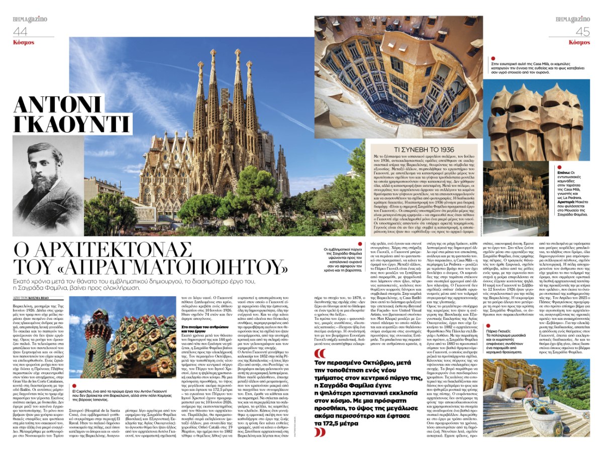 Εκατό χρόνια μετά τον θάνατο του Αντόνι Γκαουντί, το εμβληματικό του έργο, η Σαγράδα Φαμίλια, βαίνει προς ολοκλήρωση, κλείνοντας έναν κύκλο που ξεκίνησε στα τέλη του 19ου αιώνα. Το BHMAGAZINO επιστρέφει στο όραμα του Καταλανού δημιουργού και στην αρχιτεκτονική ιδιοφυΐα που συνεχίζει να συγκινεί.