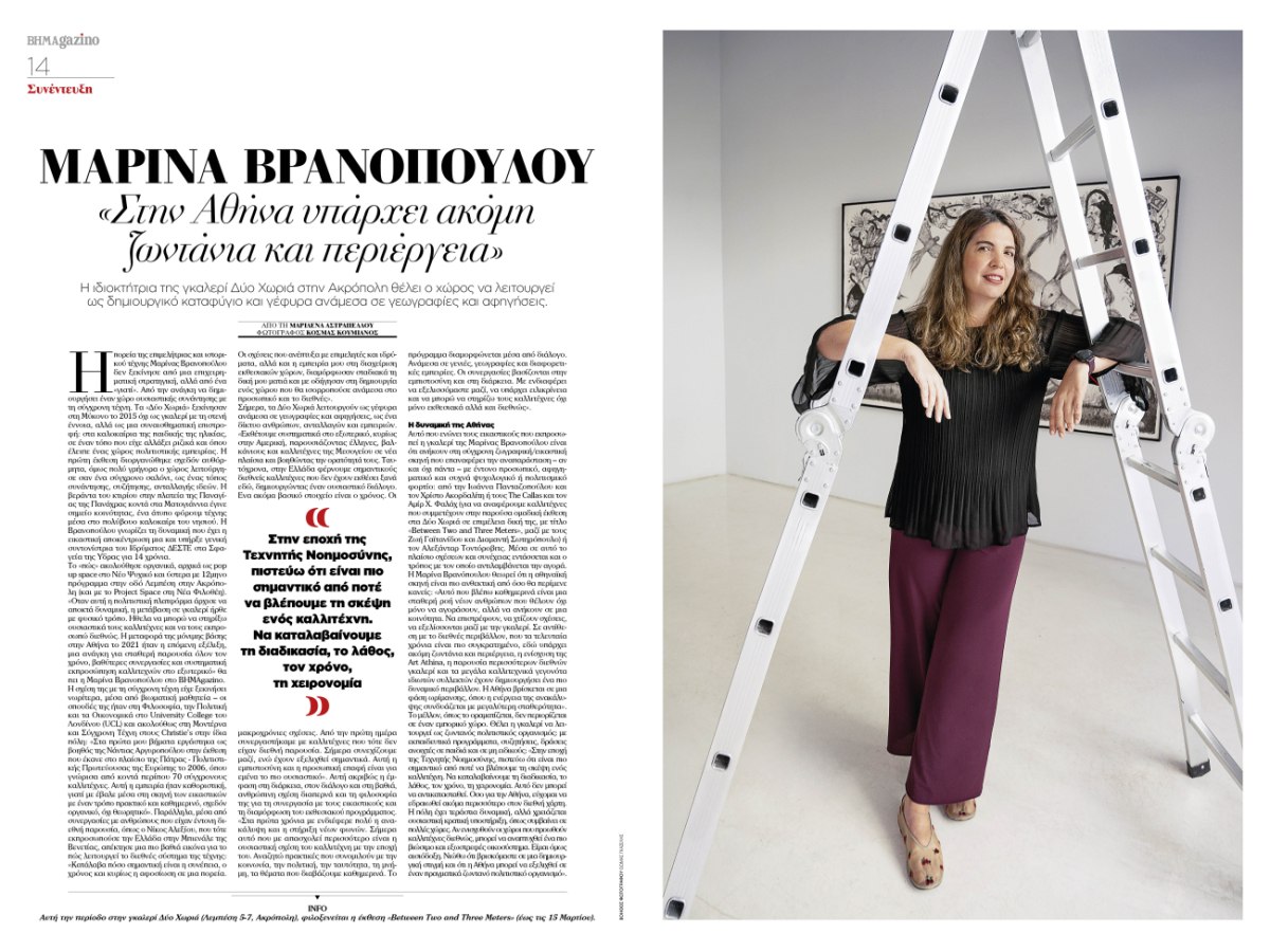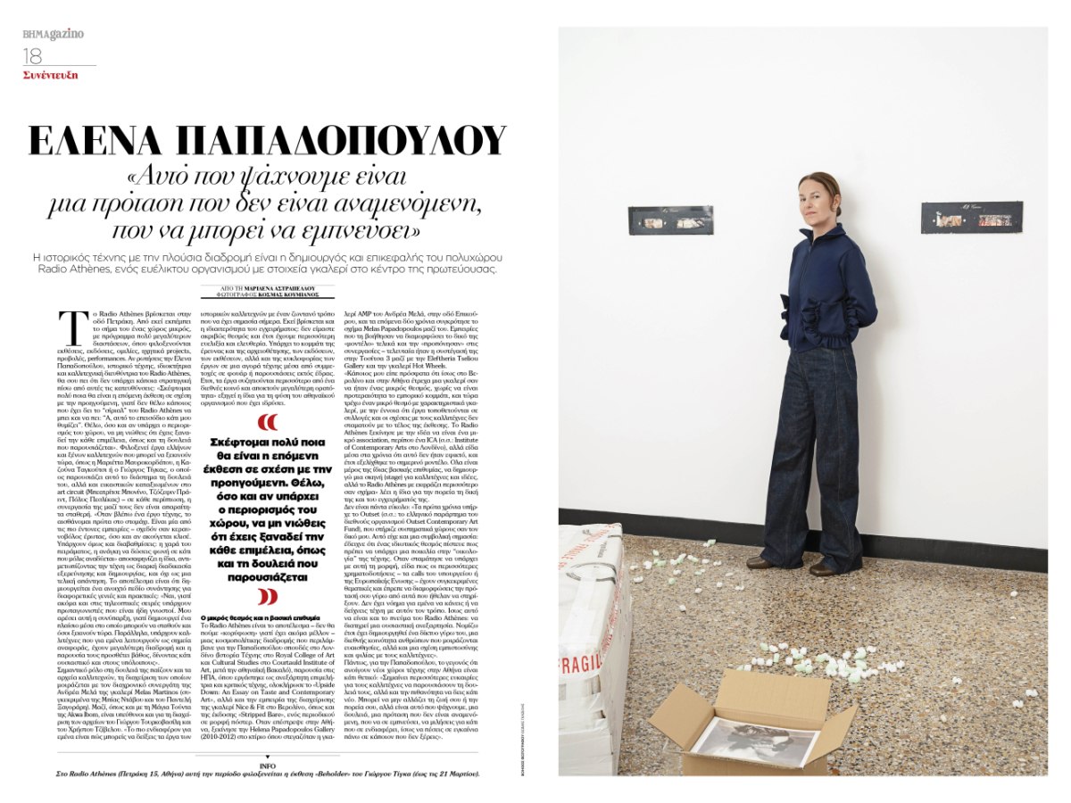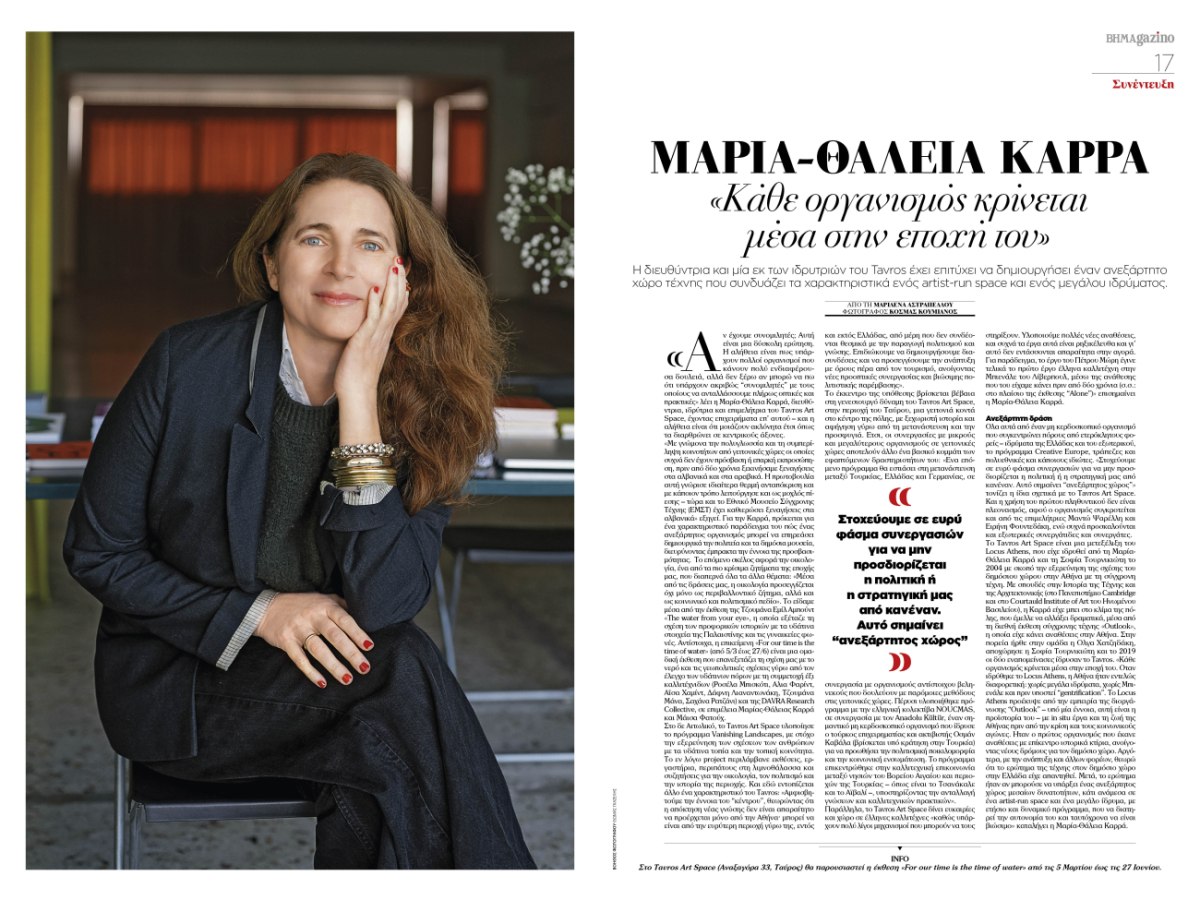 Στον χώρο της σύγχρονης τέχνης, η Μαρία-Θάλεια Καρρά, συνιδρύτρια και διευθύντρια του Tavros, έχει δημιουργήσει έναν ανεξάρτητο οργανισμό που ισορροπεί ανάμεσα σε artist-run space και μεγάλο ίδρυμα. Η Μαρίνα Βρανοπούλου, από τη γκαλερί Δύο Χωριά, οραματίζεται έναν χώρο-καταφύγιο και γέφυρα ανάμεσα σε γεωγραφίες και αφηγήσεις. Και η Έλενα Παπαδοπούλου, δημιουργός του Radio Athènes, επανασυστήνει την έννοια του ευέλικτου πολιτιστικού οργανισμού στο κέντρο της πόλης.