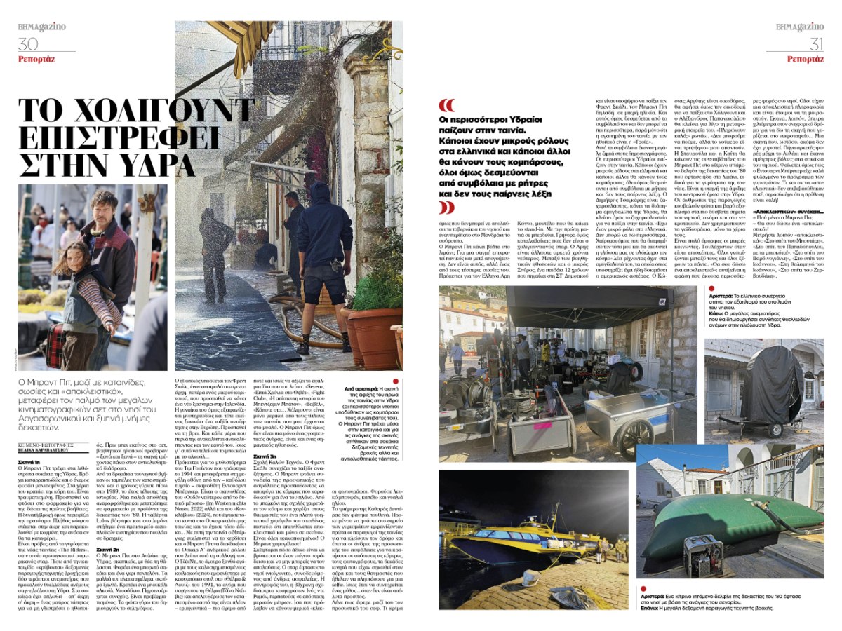Και από την Ιβηρική, στην καρδιά του Αργοσαρωνικού: το Χόλιγουντ επιστρέφει στην Ύδρα, με τον Μπραντ Πιτ να μεταφέρει τον παλμό των μεγάλων κινηματογραφικών σετ στο νησί, ξυπνώντας μνήμες από τις χρυσές δεκαετίες των διεθνών γυρισμάτων στην Ελλάδα.