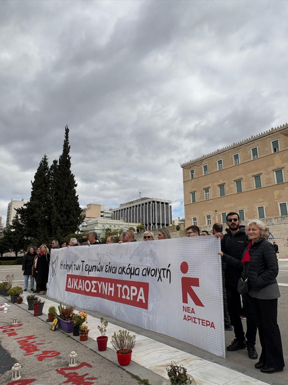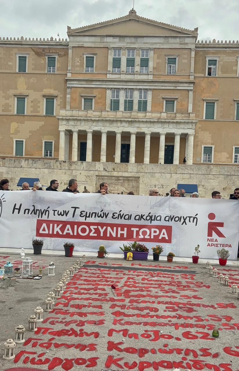 Το πανό της Νέας Αριστεράς ανέγραφε «Η πληγή των Τεμπών είναι ακόμη ανοιχτή - Δικαιοσύνη Τώρα» ώστε «να υπενθυμίσει ότι δεν πρόκειται για αριθμούς, αλλά για ζωές», τονίζεται στη σχετική ανακοίνωση