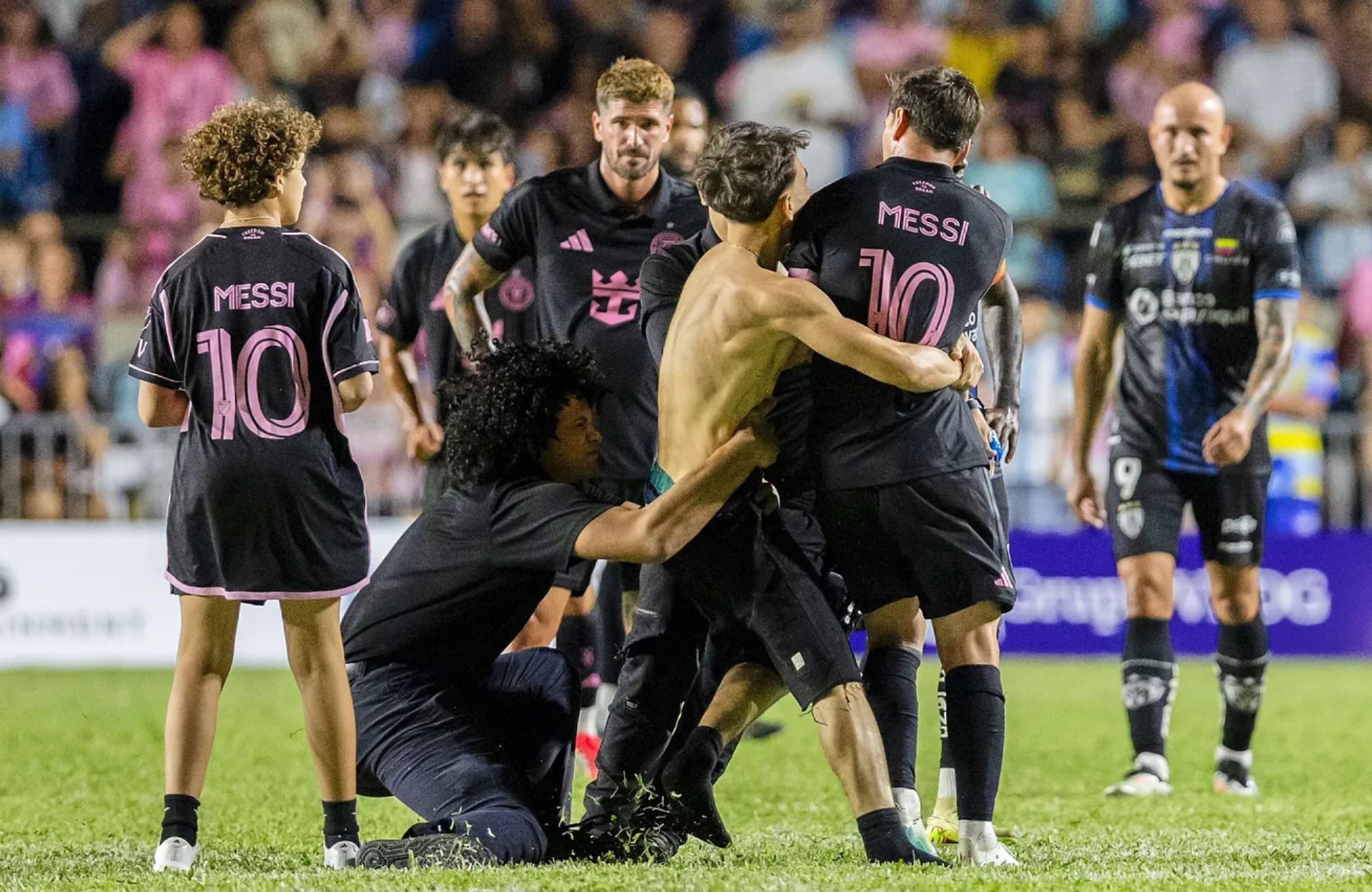 Την αρχή έκανε ένας που «μπούκαρε» στον αγωνιστικό χώρο ενώ ακόμη το παιχνίδι παιζόταν. Αφού έκανε τη βόλτα του και ενώ η ασφάλεια του γηπέδου δεν τον πρόλαβε, έπεσε πάνω στον Μέσι για να τον αγκαλιάσει. Η παρέμβαση των σεκιούριτι δημιούργησε έναν μικρό χαμό, κατά τον οποίο ο σούπερσταρ της μπάλας βρέθηκε και αυτός στον αγωνιστικό χώρο!