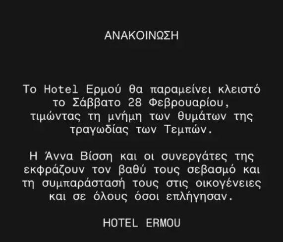 Στην ανακοίνωση αναγράφεται χαρακτηριστικά: «Το Hotel Ερμού θα παραμείνει κλειστό το Σάββατο 28 Φεβρουαρίου, τιμώντας τη μνήμη των θυμάτων της τραγωδίας των Τεμπών. Η Άννα Βίσση και οι συνεργάτες της εκφράζουν τον βαθύ τους σεβασμό και τη συμπαράστασή τους στις οικογένειες και σε όλους όσους επλήγησαν. HOTEL ERMOU».