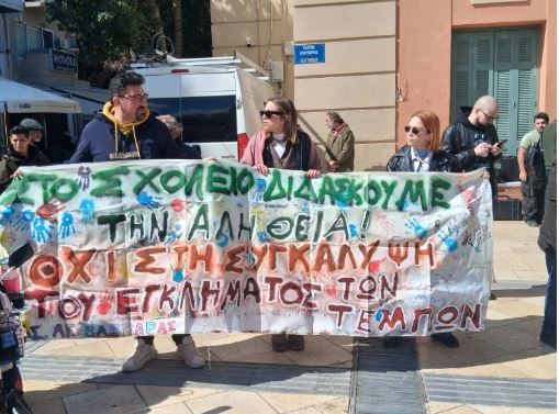 Οι διαδηλωτές κρατούσαν πανό με μηνύματα που αποτύπωναν το κοινό αίσθημα: «Στο σχολείο διδάσκουμε την Αλήθεια! Όχι στη συγκάλυψη του εγκλήματος των Τεμπών» και «Δεν ξεχνάμε τα παιδιά που δεν έφτασαν ποτέ».