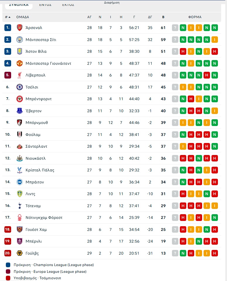 Συγκεκριμένα αυτή ήταν η 18η νίκη για την ομάδα του Πεπ Γκουαρδιόλα σε 28 παιχνίδια, χάρη στην οποία έφτασε τους 59 βαθμούς. Με τα ίδια παιχνίδια οι Άρσεναλ έχει 61, ενώ την Κυριακή (1/3) οι κανονιέρηδες υποδέχονται την Τσέλσι στο ντέρμπι της αγωνιστικής.