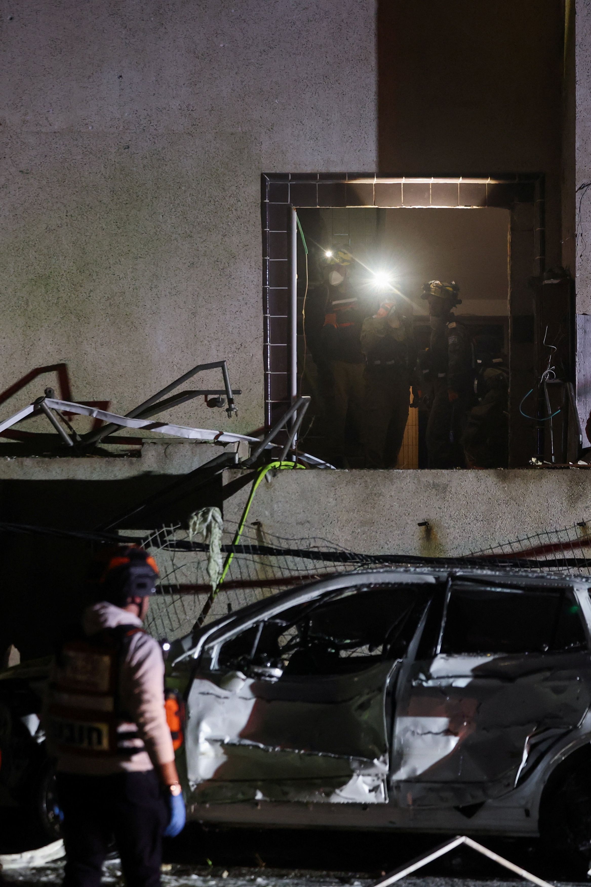 Εικόνες του AFP δείχνουν έναν δρόμο γεμάτο κτήρια με κατεστραμμένες προσόψεις και απανθρακωμένα αυτοκίνητα, όπου πυροσβέστες σβήνουν εστίες φωτιάς ενώ διασώστες απομακρύνουν τραυματίες.