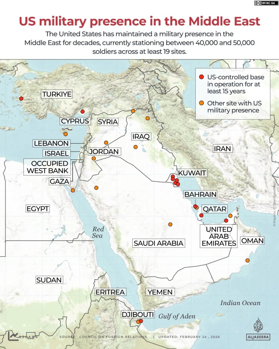 Οι χώρες με τις περισσότερες αμερικανικές στρατιωτικές δυνάμεις περιλαμβάνουν το Κατάρ, το Μπαχρέιν, το Κουβέιτ, τα ΗΑΕ και τη Σαουδική Αραβία.