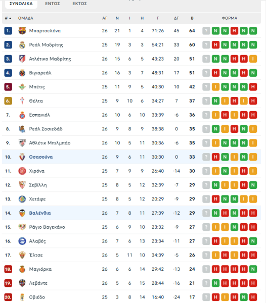 Φρένο στη φορμαρισμένη Οσασούνα έβαλε η Βαλένθια. Οι «νυχτερίδες» πέτυχαν νίκη-ανάσα 1-0 απέναντι σε έναν αντίπαλο που ήταν φορμαρισμένος καθώς η Οσασούνα ήταν έξι αγωνιστικές αήττητη, προερχόταν από νίκη επί της Ρεάλ Μαδρίτης και ελπίζει σε έξοδο στην Ευρώπη.