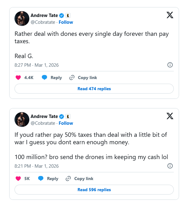 «Αν προτιμάτε να πληρώνετε 50% φόρους αντί να αντιμετωπίζετε λίγο πόλεμο, υποθέτω ότι δεν κερδίζετε αρκετά χρήματα», έγραψε χαρακτηριστικά, προσθέτοντας πως «περισσότεροι άνθρωποι πέθαναν σήμερα σε μαζικές πυροβολισμούς στις ΗΠΑ από όσους έχουν πεθάνει στο Ντουμπάι από τότε που ξεκίνησαν οι βομβαρδισμοί».